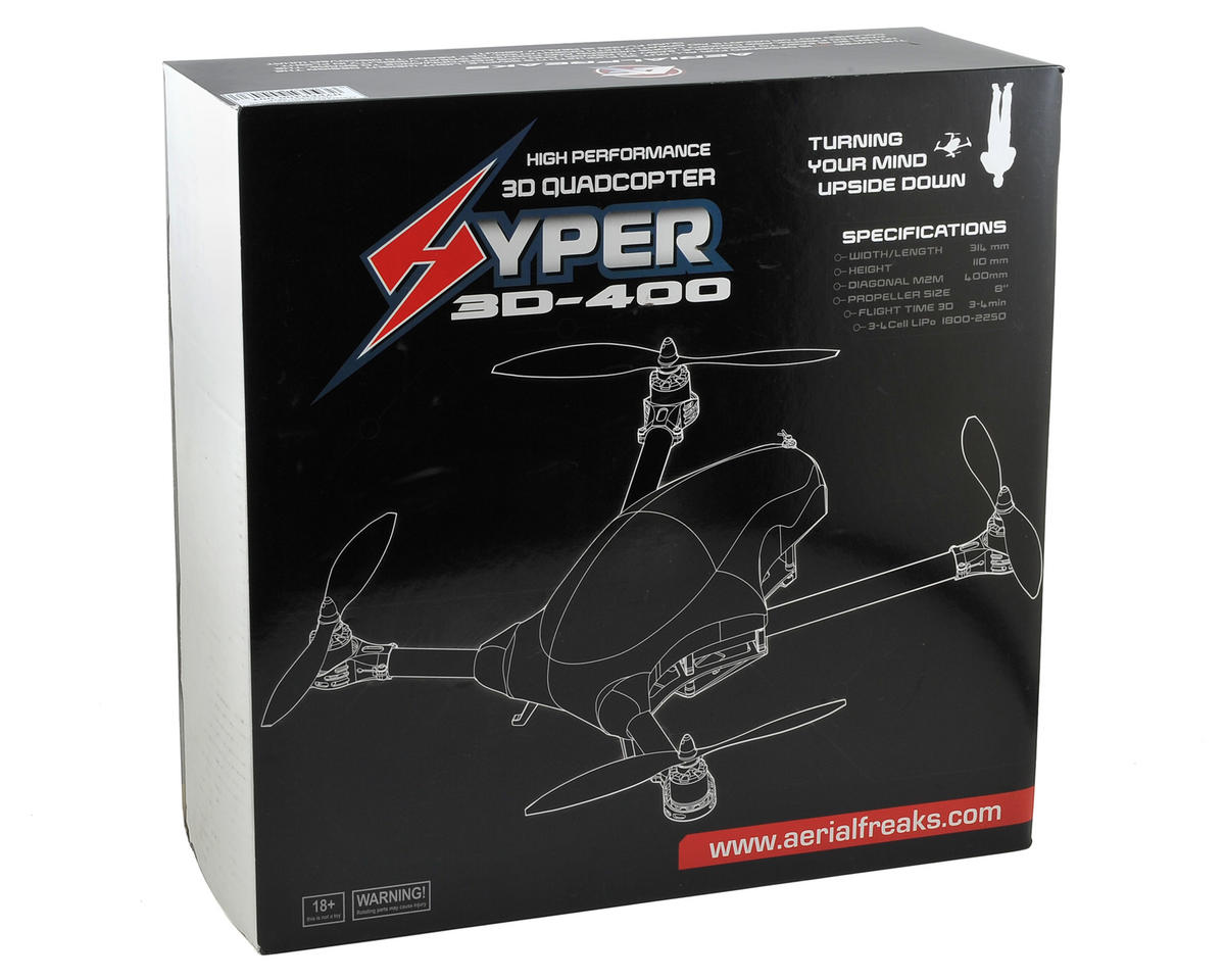 This is the AerialFreaks Hyper 400 3D Almost Ready to Fly Quadcopter. In a quest to dispel the myth that quadcopters are only for aerial photography, the Hyper 3D was developed to flip and roll, offering incredible 3D performance for pilots that want more than pretty pictures.