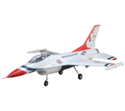 The E-flite F-16 Thunderbirds 70mm EDF jet is a replica of the iconic aircraft flown by the U.S. Air Force Thunderbirds. Like the full-scale airshow thriller, this F-16 has an incredibly wide flight performance envelope—from slow and stable high-alpha flight to amazing high-speed and vertical capabilities. At its core is a 6S-compatible brushless motor and a 70-amp ESC that are matched to a 12-blade fan to deliver an abundance of speed, thrust and a turbine-like sound. Factory-installed electric retracts with shock-absorbing struts make it possible to take off and land on a wider variety of surfaces–including grass—while keeping ground handling smooth and delivering a realistic jet experience. The composite reinforced EPO airframe is lightweight yet strong, and the digital, metal-geared servos plus ball-link equipped linkages provide precise control. And it all combines to deliver one of the easiest to fly yet highest-performance and most capable F-16 models ever!