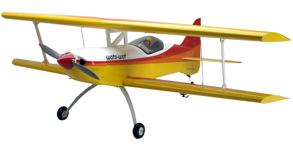 he Wots Wot was designed by Chris Foss many years ago as a traditional balsa kit but it has since be re-designed as this superb ARTF aircraft with a lighter structure and numerous improvements It has by general agreement the best flying characteristics of them all! With its sleek aerodynamic design and relatively large wing area the Wots Wot has incredible low speed handling, being able to fly at amazingly slow flying speeds, yet open the throttle and the aerobatic performance and precision is truly outstanding! Suitable for I/C use with .70 to .81 four stroke engines or electric power with suitable motor and 5 cell battery pack, the Wots Wot is compact enough to fit into most cars in one piece, even hatchbacks, however the model has been optimised for rapid assembly/disassembly, requiring only 6 screws tightening and 2 clevises connected. The model is supplied as an airframe only, with separate I/C and electric power option fitting packs, the I/C pack containing engine mount, fuel tank, spinner and throttle linkage, the electric pack has motor mount, battery mounting tray with 2 battery straps, magnetically attached hatch cover and mounting frame and spinner with alloy backplate. Flight times of over 12 minutes of mixed flying were achieved during test flying of the prototype models using a 5S 4500mAh battery pack!